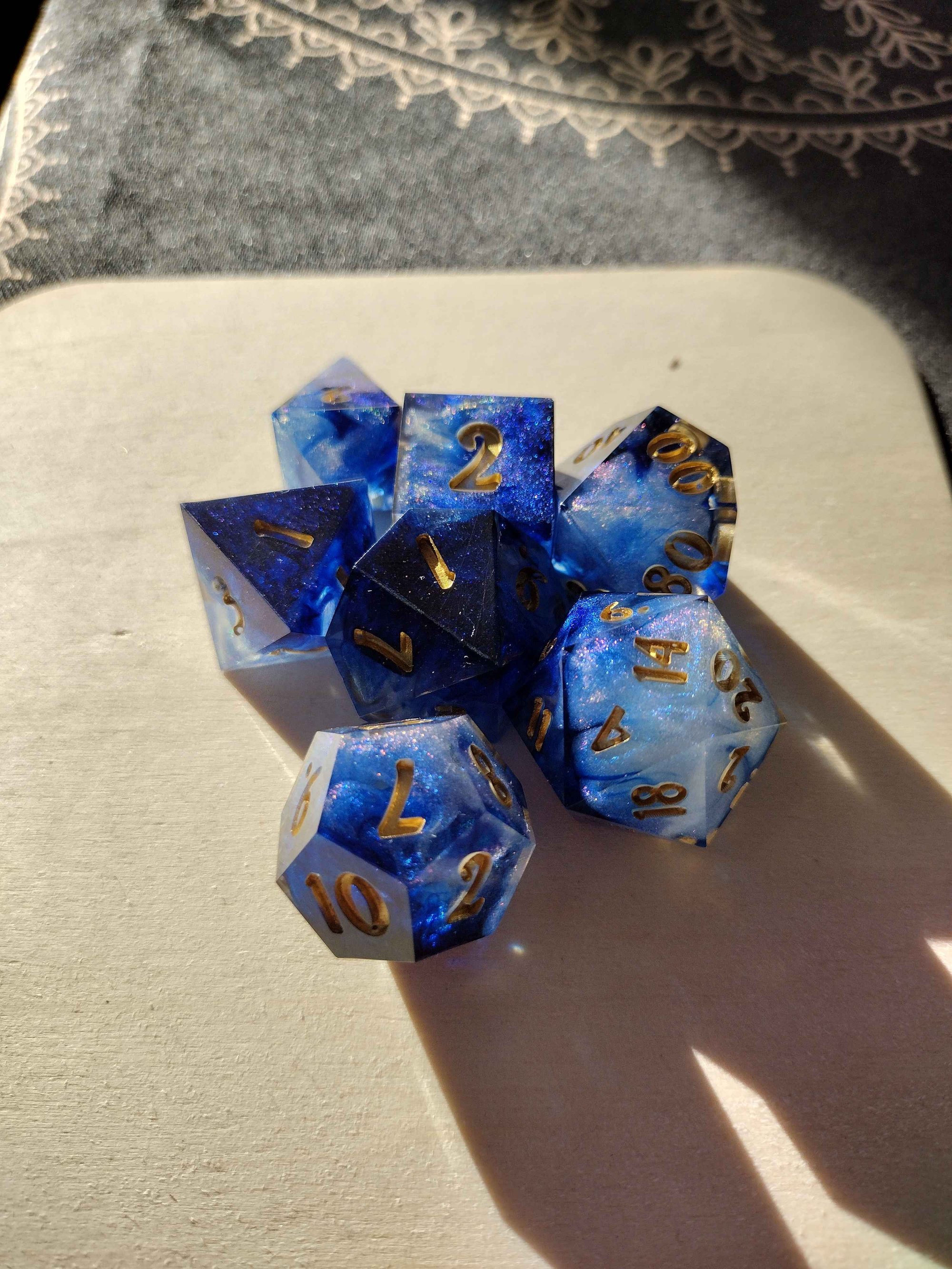 Beautiful blue and color shifting white to pink and purple give the feel of tides crashing and foaming beneath your feet.