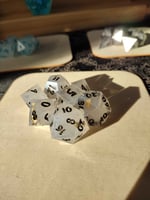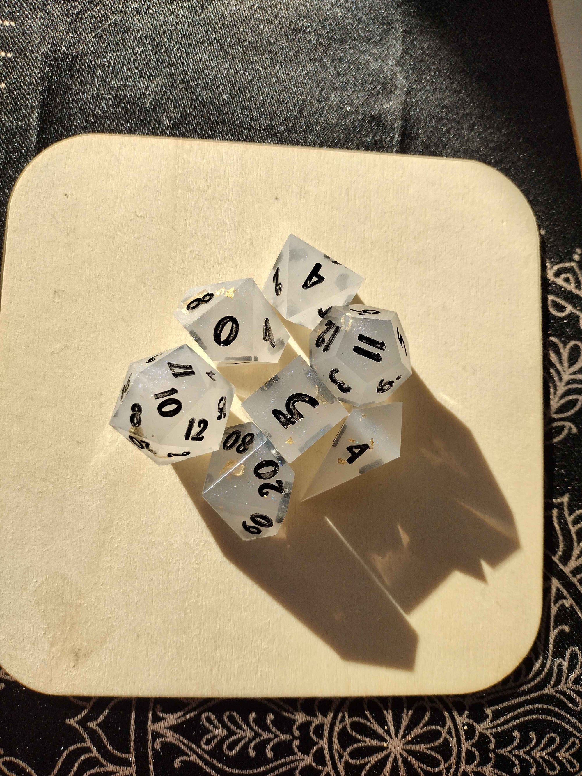 A semi-translucent white base with golden flecks strewn within give these dice a rather fine elegance highlighted by the blackish-gold inking.